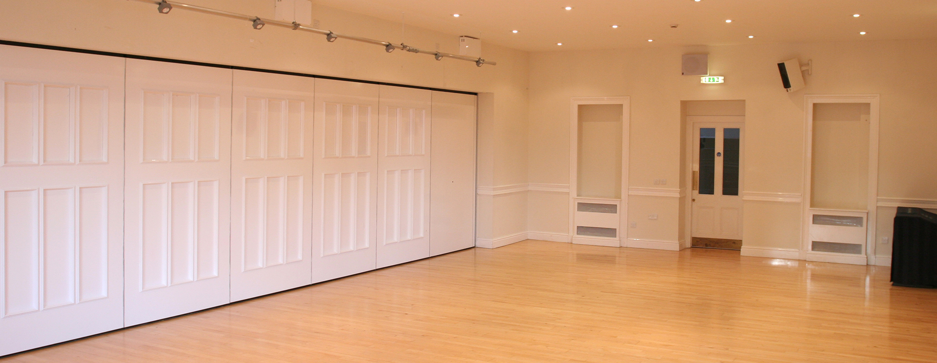 The Lansdown Hall is located on the ground floor of the centre and is accessed from the Courtyard end of the building or via the back corridor. The Courtyard Entrance has a small foyer area where a few people can wait before their session starts. The Lansdown Hall has no kitchen directly attached to it, but access to the main kitchen is possible via the back corridor if required. The hall has AV projection facilities with a built in projection screen and ceiling mount for projector. AV facilities are available at an extra charge. With its sprung wooden floor it’s great for dance and fitness classes, parties, training sessions and functions. The Lansdown Hall forms the smaller part of the